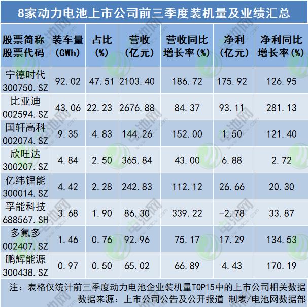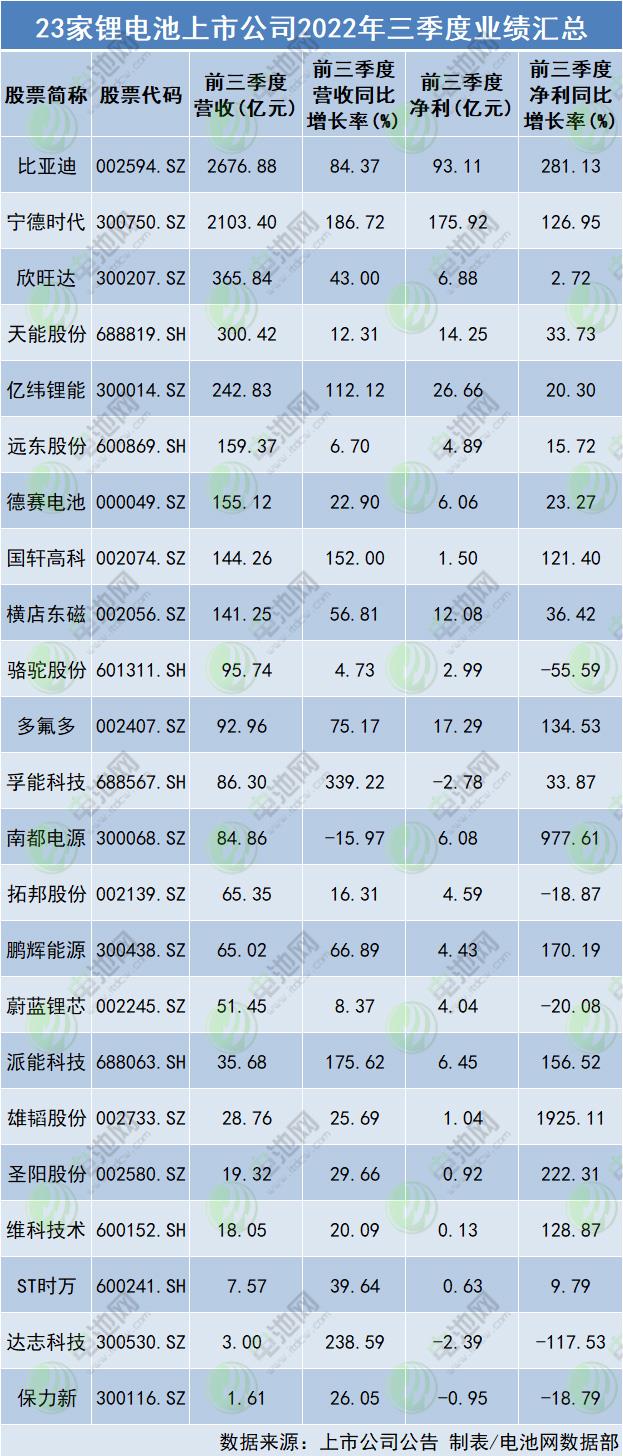 除中創新航未(wei)公開披露三季(jì)報,電池網注意(yi)到,動力電池企(qi)業業績迎來盈(yíng)利修複。前三季(jì)度,8家動力電池(chi)🌐上市公司營收(shou)㊙️總額5777.49億元,平均(jun)營收722億元,其中(zhong),甯德時代、比亞(yà)🈲迪營收超2000億元(yuán),甯德時代、國軒(xuān)高科、億緯锂能(neng)、孚能科技營收(shōu)同比增長翻倍(bei),孚能科技💞營收(shou)同比增長超3.3倍(bèi);利潤總額323億元(yuan),平均淨利40.38億元(yuan),其中,甯德時代(dài)淨利超170億元,甯(níng)德時代、比亞迪(dí)、國軒㊙️高科、多氟(fu)多、鵬輝🔴能源淨(jìng)✔️利增長同比翻(fan)倍,比亞迪淨利(li)增長超2.8倍。
