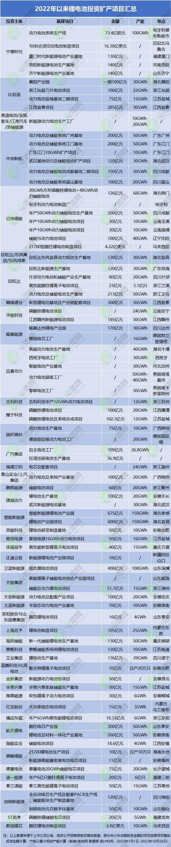 12月1日電池網公(gong)布的數據顯示(shì),據不完全統計(ji),2022年以來,僅在锂(li)✔️電池生産制造(zao)領域,新公布的(de)投資擴産項目(mù)就多達84個🌈,其中(zhōng)有69個♌公布投資(zī)金額,總金額超(chao)8427億元,平均單個(ge)項目投資額超(chāo)122億元;公布年産(chǎn)能的項目有68個(ge),總産能約2038GWh。